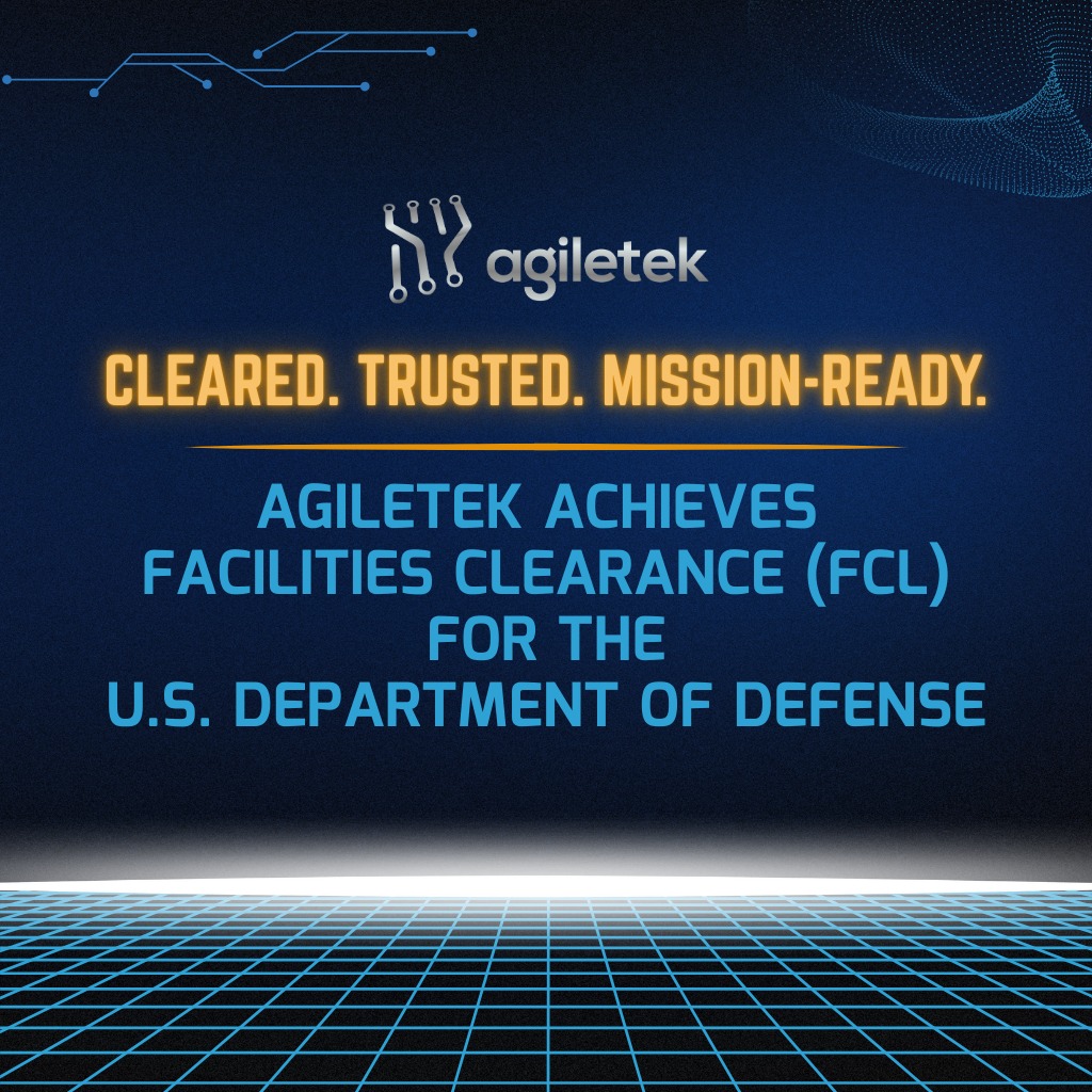 Agiletek is proud to announce that the company has officially received its Facilities Clearance (FCL) from the U.S. Department of Defense (DoD), a major milestone that further reinforces Agiletek’s commitment to supporting national security missions with trust, integrity, and operational excellence.